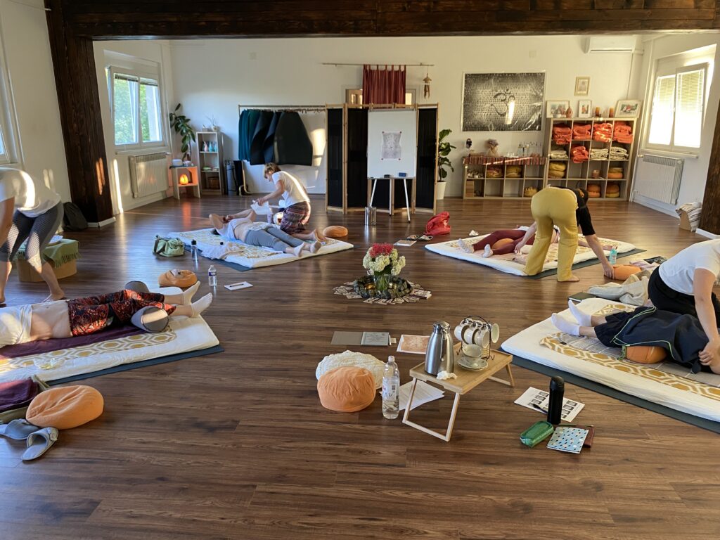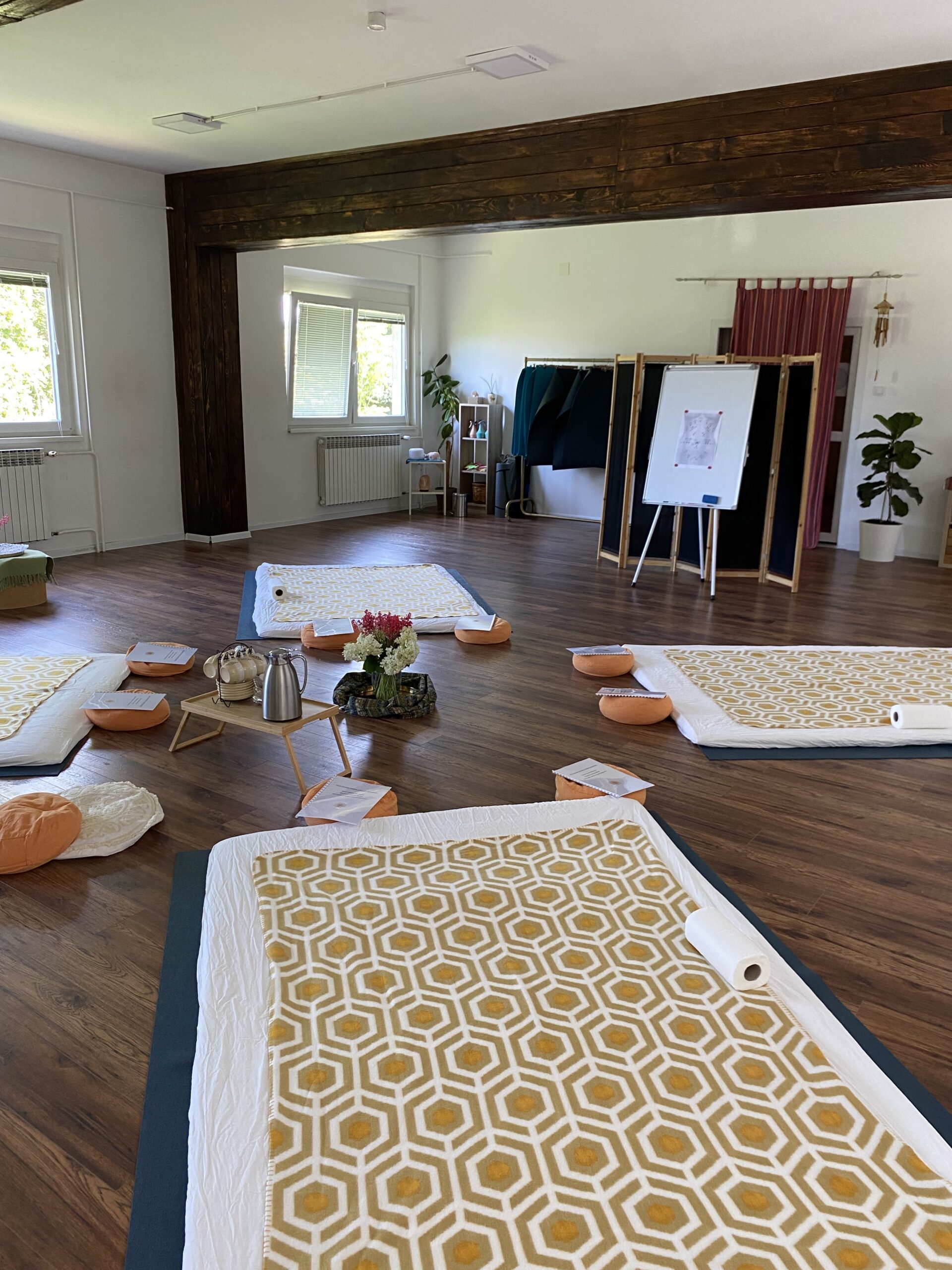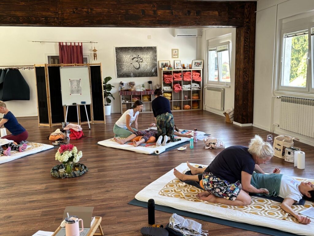 Radimo u maloj grupi od 8-12 polaznica, na madracima na podu, sva oprema je osigurana.