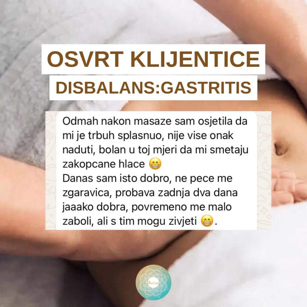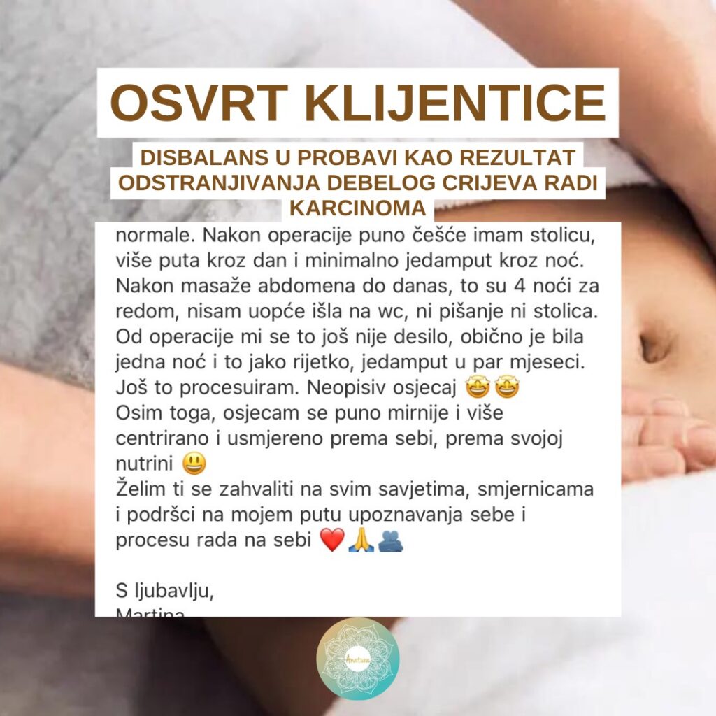,, Od jučerašnje abdominalne masaže išla sam na WC dva puta. Čudo je vidjeti da mi probava radi i da s lakoćom obavljam nuždu. Osjećam se PUNO lakše i MEKŠE u svom trbuhu! ‘’